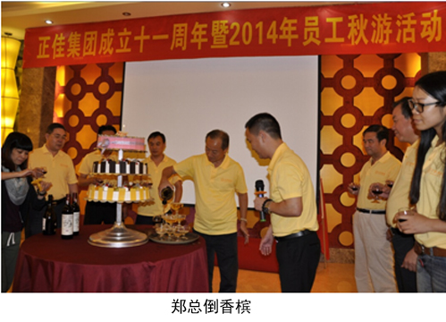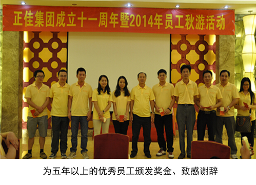 2014年10月17日晚,郑总与全体员工在广东河源共进晚餐,共同庆祝正佳国际集团十一岁生日,为答谢为集团辛苦奉献、挥洒青春的“佳人少年”,郑总在现场为五年以上的优秀员工颁发奖金、致感谢辞。现场气氛激扬、热烈、感人至深!