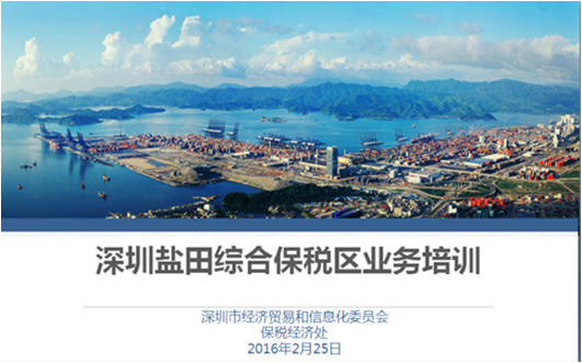 2016年2月25日正佳国际集团盐田公司报关部副经理周凯锋随总经办领导等一行3人 参加由深圳市经济贸易和信息化委员会保税经济处在三洲田深圳会计进行学院主办的盐田综合保税区培训会,会上由 深圳海关、电子口岸深圳分中心、盐田国检局保税办、国税局、外汇管理局和经贸委等部门工作人员分别给参与培训 的160多家相关企业就盐田综保区的功能、政策、海关 信息系统、检验检疫申报系统、特殊监管区域税收政策之如出口退税、外汇管理等做了简要讲解。