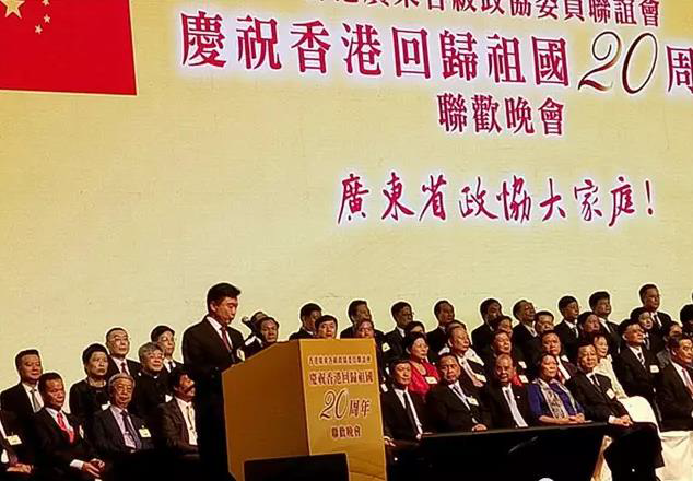 7月10日,香港广东各级政协委员联谊会举办庆祝香港回归祖国20周年联欢晚会。全国政协副主席董建华、梁振英,香港特区行政长官林郑月娥,广东省政协主席王荣,省委常委、统战部部长严植婵,深圳市市侨联副主席、正佳国际集团总裁郑凯平等全省各市、县(区)政协和统战部领导,香港广东各级政协委员联谊会会员共1800人参加活动。