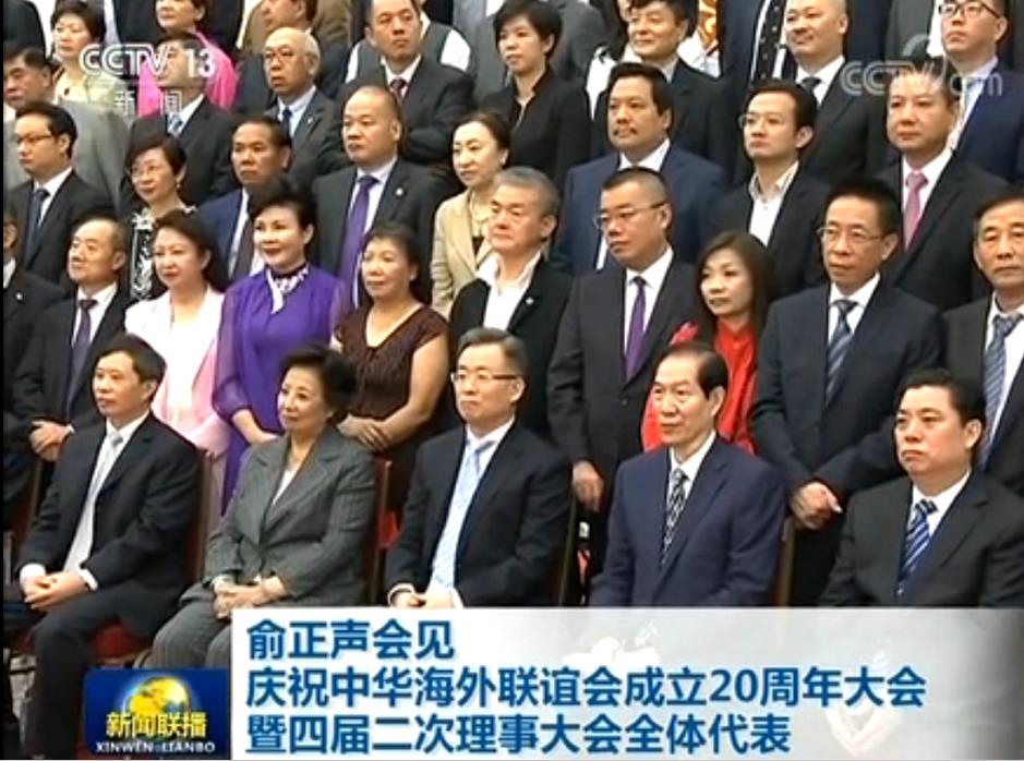 中共中央政治局常委、全国政协主席俞正声于9月20日在北京人民大会堂会见出席庆祝中华海外联谊会成立20周年大会暨四届二次理事大会的全体代表,与全体代表合影留念并讲话。俞正声代表中共中央向中华海外联谊会成立20周年表示热烈祝贺。 深圳市侨联副主席、正佳国际集团总裁郑凯平应邀出席此次大会。