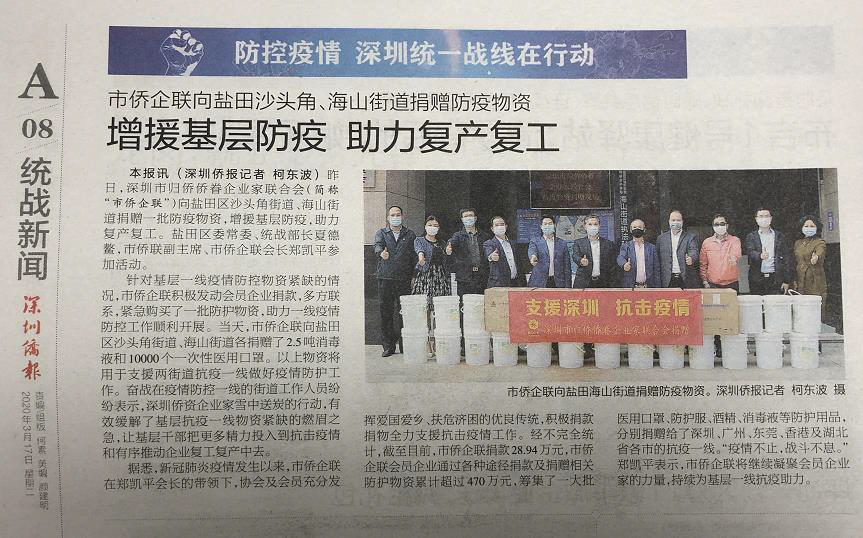 疫情防控,深圳统一战线在行动市侨企联向基层抗疫一线捐赠防疫物资